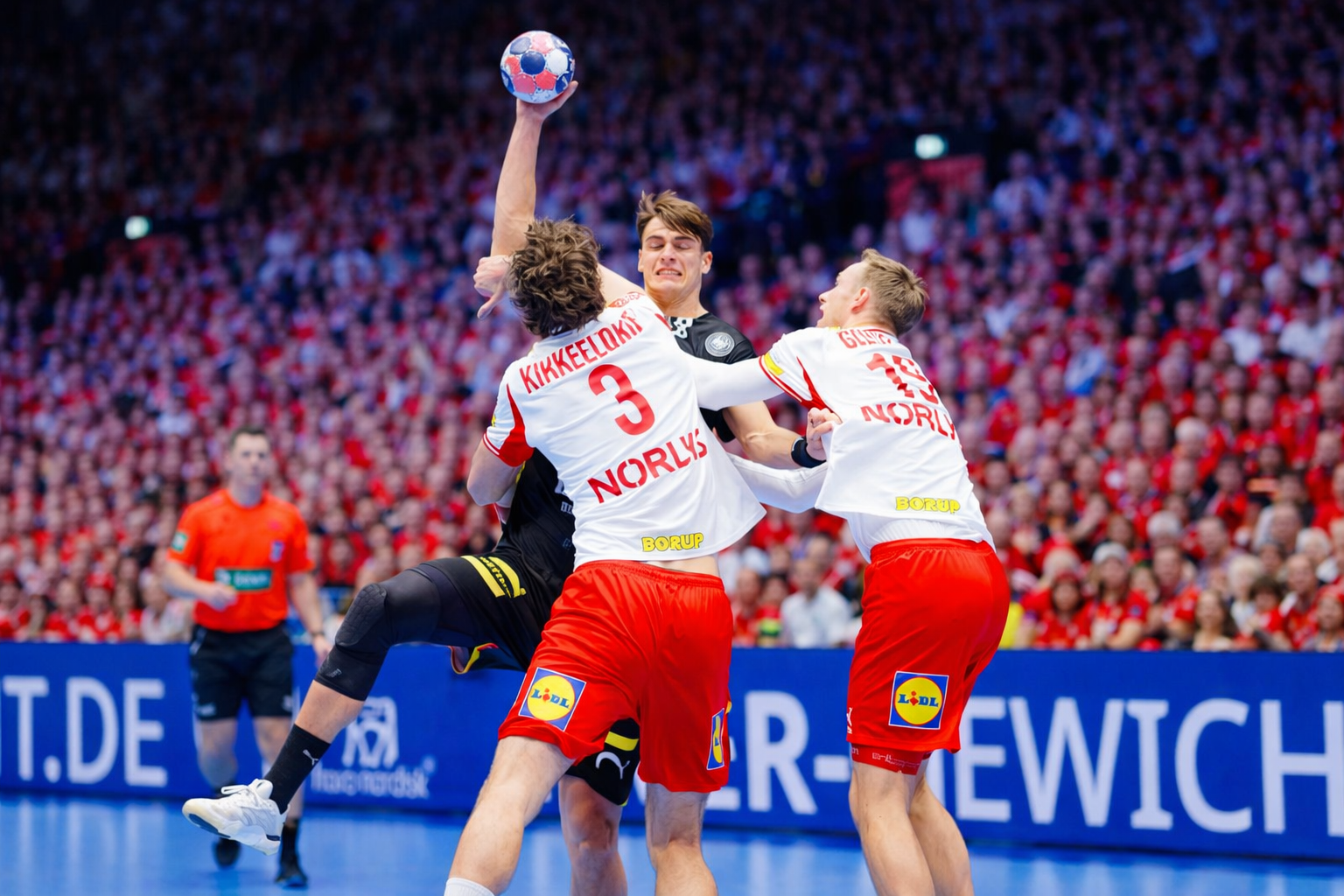 Nach dem Seitenwechsel warteten beide Teams lange auf Treffer, ehe Marko Grgic den Ausgleich erzielte. Das Ziel, dem Favoriten vor heimischem Publikum ein Bein zu stellen, schien zum Greifen nah. Doch eine Phase mit mehreren Zeitstrafen gegen Deutschland kippte die Partie. In Überzahl zogen die Dänen davon, angeführt von Gidsel und einem überragenden Emil Nielsen. Der Torhüter des FC Barcelona sammelte 14 Paraden und wurde zum Spieler des Spiels.
